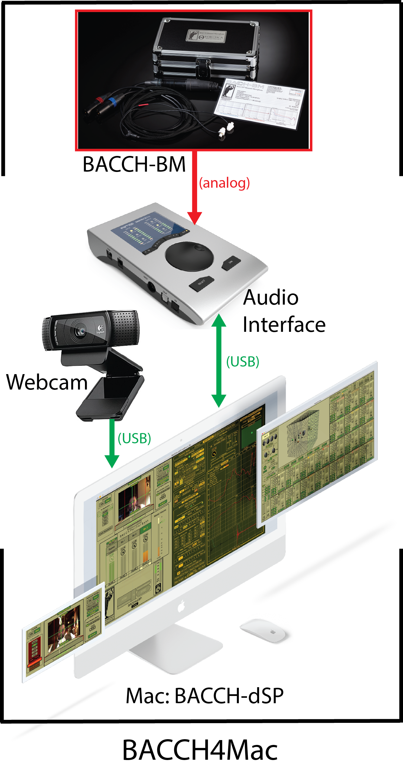(The BACCH-BM is not inclcuded in the Intro Edition of BACCH4Mac. The product shown in the photo on the right is the BACCH-BM Pro. The regular BACCH-BM looks identical to the Pro version with the exception that it has slightly larger microphone capsules, and has a flat frequency response that extends to 20 kHz.)